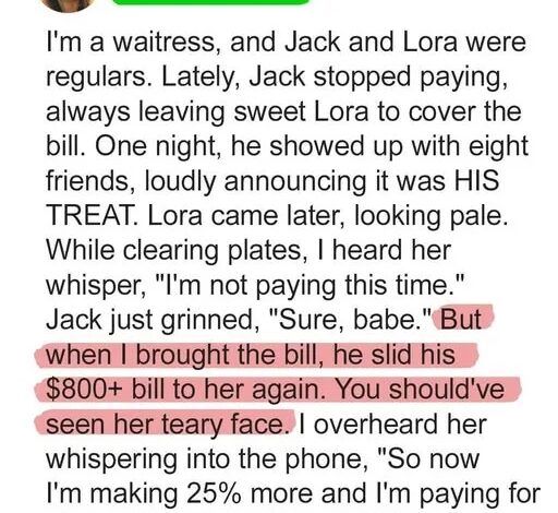 At first, I thought it was just one of those small habits couples fall into. But it became a pattern. Jack always had an excuse—forgot his wallet, left his card in the car, waiting for a “bank transfer.” He’d chuckle and brush it off like it was a joke. Lora would smile weakly and reach for her purse. But her eyes—those tired, sad eyes—told the real story.